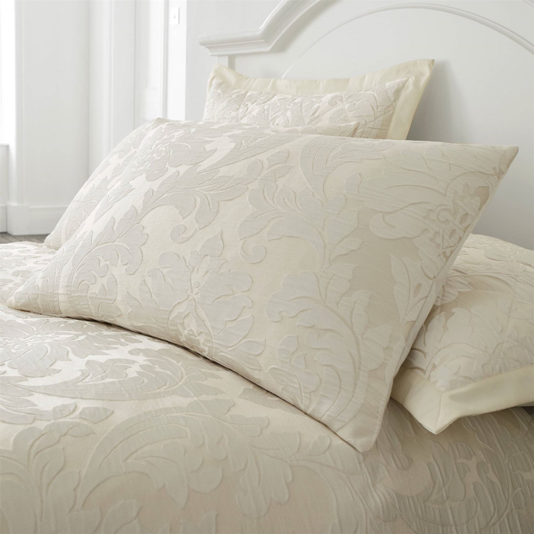 4.4 out of 5 stars with 10 ratings. The contemporary damask design is woven. The set includes a quilt, two pillow shams, one square throw the pillow and one rectangular throw the pillow, perfect for yourself or a guest room. The shams reverse from the damask to the ogee and are trimmed with braided cord. The damask pattern of this bedding set will brighten any bedroom.